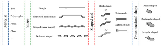 The greater advantage—also related to its disadvantages—of fiber-reinforced concrete is that it allows the individual design of concrete compositions and the dosing of fibers, which makes it difficult to generalize knowledge and limits the possibility of structural design use. It should also be noted that there are many variants of fibers. Selected variants and possible divisions of fiber types for fiber-reinforced concrete are shown in Figure 2.