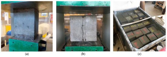 Test specimens before and after the test: (a) compressive strength test, (b) split tensile test, (c) storage of samples in water.