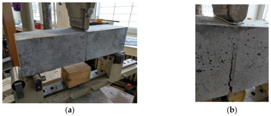Another important type of tests are bending tests, which make it possible to determine the tensile strength in bending. Load-displacement diagrams are an important output of these tests. As part of the bending tests, three-point tests were performed with a notch of 25 mm and a span of 500 mm [12]. The results of the bending tests also include load-displacement diagrams. Details of the test series are presented, along with the numbers of samples, in Table 4. Figure 6a shows a three-point bending test with a notch and Figure 6b shows a crack in the test specimen.