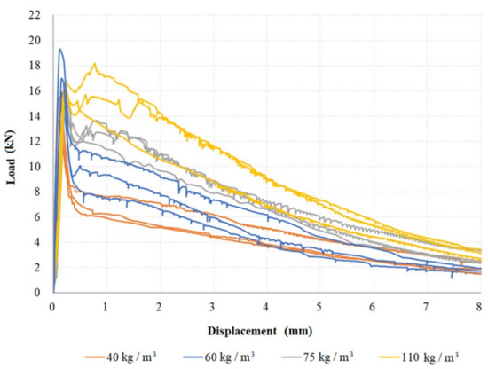 Bending tests of fiber-reinforced concrete were performed at fibers dosages of 40, 60, 75, and 110 kg/m3. Three samples (tests) were performed for each dose. The three-point bending test results are shown in Figure 7. In the load-displacement diagrams, one can observe that for all dosages, residual tensile strength was evident after the formation of a crack in the test beam. However, for dosages of 40 kg/m3, the residual strength was relatively small. For fiber dosages of 60 and 75 kg/m3, increases in the residual tensile strength were clearly visible. In the case of a fiber dosage of 110 kg/m3, the effect of tensile strengthening after the formation of the initial crack was noticeable. The final residual strength values observed for deformations of 8 mm were in a relatively small range for all tested specimens. Test samples with a fiber dosage of 60 kg/m3 show higher peak strength than the other samples, but the next section of the load-displacement curve displayed the expected residual tensile strength, between the curves of 40 and 75 kg/m3, as can be assumed. The higher peak load values observed for a fiber dosage of 60 kg/m3 could be caused by the material variability of fiber-reinforced concrete, and it would be appropriate to perform more tests. However, our overall assessment of the course of the curves has a representative character. The addition of fibers always increased the peak value of the load, and the influence of dosage was particularly visible on the residual tensile strengths, i.e., on the downward (softening) curve of the load diagram.