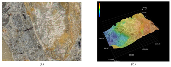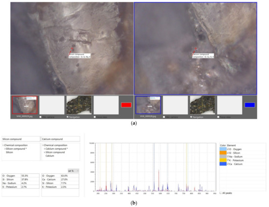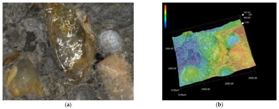 The first selected area is shown in Figure 9a and covers an area of 1000 × 1500 μm. The different material components of the structure of fiber-reinforced concrete are also clearly visible in Figure 9. For a better study of the structure, it is possible to visualize the surface, where the maximum difference in the surface is 585.99 μm. In further research, scanning of a two-fold area was performed, as shown in Figure 10, which covers an area of 2000 × 3000 μm. In this case, the differences in the concrete components were even more pronounced, and the maximum difference in the surfaces reached 707.01 μm. These analyses were followed by material analysis using high-speed analysis LIBS (Laser-Induced Breakdown Spectroscopy), which is one of the methods of atomic emission spectroscopy. Two different sites from the laboratory sample were chosen for the analysis of the elements, and the sites are marked in Figure 11. The results of this analysis revealed that the main element content was oxygen for both sites, at around 55%–63%. In the case of the first site, silicon (37%) and sodium (4%) also had a significant share. The composition differed for the second site, with a more significant proportion of calcium (27%) and silicon (7%). The results of the analysis were in agreement with the expected assumptions. The determined composition corresponded to our assumptions, as we expected to observe the required mechanical properties and resistance.