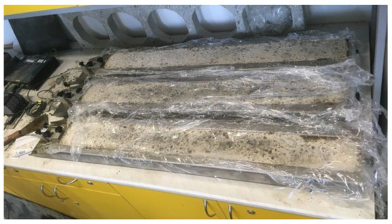 The monitoring of volume changes with Schleibinger Testing Systems [54] took place in two phases. In the first phase, from 16 December 2020 for a period of 42 days, volume changes in plain concrete were recorded. In the second phase, from 3 March 2021 for a period of 42 days, volume changes in the fiber-reinforced concrete mixture were recorded, using MasterFiber 482 steel fibers with a dosage of 90 kg/m3. In both cases, volume changes were observed in three mixtures in measuring troughs measuring 60 × 100 × 1000 mm (with a height of 60 mm) for 42 days, with the mixtures in the two troughs being wrapped in a protective foil throughout the maturation process, and a mixture in one gutter matured in the air (see Figure 15). Samples wrapped in foil were used to simulate ideal conditions with regard to concrete treatment. For a sample, when there is air access, the sample may be more susceptible to drying and this is typical for cases of bad technological discipline.
