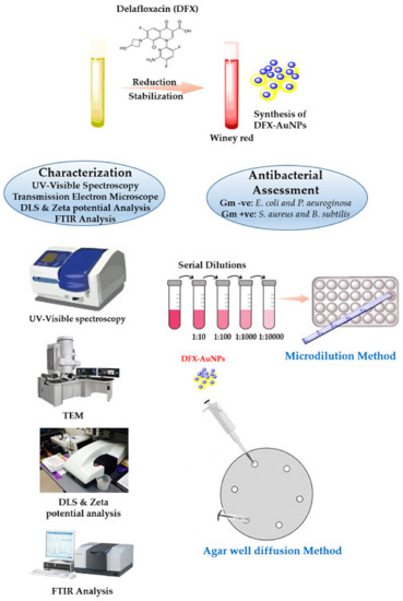 The aim of this study, therefore, was to prepare delafloxacin-gold nano-formulation to increase the antibacterial potential of DFX. A one-pot synthesis approach for the fabrication of DFX-AuNPs was adopted wherein DFX was exploited as a reducing and capping agent to convert gold salts into AuNPs, rather than using an external reducing/capping agent. In addition, a variety of analytical techniques including UV-visible spectrum, transmission electron microscopic analysis, dynamic light scattering, and zeta-potential analysis were applied to characterize DFX-AuNPs. Further, the amount of DFX loaded on the AuNPs was estimated prior to antibacterial assessment against different bacterial strains. The schematic representation of work performed in the current study has been shown in Figure 1.