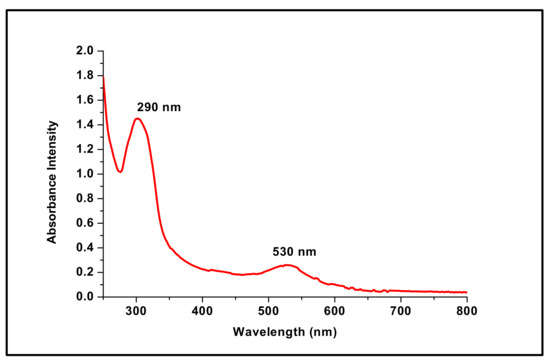Gold nanoparticles have a unique optical property known as localized surface plasmon resonance, resulting in a characteristic absorbance band in the visible region (500–600 nm), which can be measured by UV-Vis spectroscopy. In this study, a characteristic absorbance peak at 530 nm was observed in the UV-Vis spectrum of the reaction mixture (Figure 2). Importantly, it was within the characteristic plasmon peak range of AuNPs, indicating the successful synthesis of AuNPs [30]. In addition, the presence of an additional peak at 290 nm (Figure 2), which is specific to the DFX molecules [31], confirmed the efficient loading of DFX onto the surface of AuNPs. Notably, the color change of the reaction mixture from light yellow to the characteristic wine-red color also confirmed the formation of DFX-loaded AuNPs. Collectively, these findings clearly confirm the efficient attachment/capping of DFX molecules on the AuNPs surface and underscore the applicability of DFX as an effective reducing agent, resulting in the reduction of gold salt to AuNPs in a controlled manner.