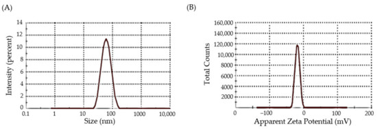 Dynamic light scattering (DLS) is a well-established technique for determining the size and size distribution of nanoparticles in a dispersion [32]. The random change in the intensity of light scattered from a dispersion of nanoparticles is utilized to calculate particle size. As depicted in Figure 4A, DFX-AuNPs showed an average hydrodynamic size as 80 nm. The comparatively larger size of DFX-AuNPs assessed by DLS (80 nm) with regard to that assessed by TEM (16 nm) might be accounted to the use of dispersant in DLS. In general, particle size estimate in TEM is done in the dry condition; TEM estimates the precise size of individual particles while ignoring the influence of the attached dispersant’s solvent layer. By contrary, the DLS technique calculates particle size as a hydrodynamic diameter (hydrated state). As a result, the particles will have a greater hydrodynamic volume owing to the solvent effect in the hydrated state.