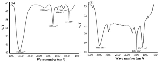 FTIR studies can be adopted to recognize the possible agents/molecules responsible for capping and efficient stabilization of the metal nanoparticles. In this study, FTIR spectral analysis was obtained for the confirmation of attachment of DFX molecules over the surface of AuNPs. The major peaks recorded in the pure DFX sample were attributed to the functional groups: –O–H stretching (3433 cm−1), carboxylic –C=O stretching (1638 cm−1), C–F stretching (1061 cm−1) and C–Cl stretching (771 cm−1), which confirms the purity of the DFX antibiotic [34]. However, post synthesis of DFX-AuNPs, an elevation in the –O–H stretching peak intensity along with reduction in peak intensities at the respective –C=O stretching, C–F stretching and C–Cl stretching positions were observed (Figure 5A,B), which was attributed to the conformational change occurred in the DFX after capping onto AuNPs. Moreover, nitrogen of piperazinyl group of DFX might have played an important role in the interaction with AuNPs. Similar to the present study, other authors [35,36] also suggested that fluoroquinoloid antibiotics (norfloxacin, ciprofloxacin, and gatifloxacin) might interact with AuNPs via nitrogen of the piperazinyl group.
