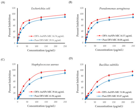 The results obtained from agar well-diffusion prompted to estimate the MIC (Figure 6) for DFX and DFX-AuNPs against the tested bacterial strains. The MICs of pure DFX were found to be 29.51 µg/mL, 30.08 µg/mL, 61.96 µg/mL and 85.07 µg/mL against Escherichia coli, Pseudomonas aeruginosa, Staphylococcus aureus and Bacillus subtilis, respectively. However, the MICs of DFX-AuNPs were 16.74 µg/mL, 16.57 µg/mL, 39.44 µg/mL and 51.86 µg/mL against Escherichia coli, Pseudomonas aeruginosa, Staphylococcus aureus and Bacillus subtilis, respectively.