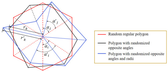 where is the angular transformation coefficient, and and are the randomized characteristic angles. The characteristic radius of the regular polygons is randomized, according to the following formula.