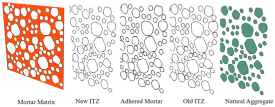 RAC is a five-phase complex structure composed of natural aggregate, adhered mortar, new cement mortar, and new and old ITZ [11]. Recycled coarse aggregate (RCA) extracted from abandoned buildings is considered to be a feasible and sustainable substitute for natural aggregate [12]. RAC is the concrete prepared by crushing waste concrete into coarse aggregate and replacing natural aggregate in whole or in part [13,14]. The use of RAC can not only reduce environmental pollution, but also reduce the extraction rate of natural aggregate, which is consistent with the concept of sustainable development [15,16]. However, the existence of adhered mortar of RCA makes the composition of ITZ in RAC more complex than that of ordinary aggregate concrete (NAC). The natural defects such as brittleness and easy cracking of RAC are more prominent, and the mechanical properties and durability of NAC are worse than those of NAC [17,18]. At present, scholars have carried out a large number of basic experimental studies and achieved a lot of results, but due to the difference in experimental conditions, the instability of RCA sources, and many other factors, the research conclusions are quite different, even contradictory [18,19]. At the same time, the development of microcracks inside specimens cannot be accurately observed in the field test process, and the research on meso-damage mechanism, multi-axial strength, and constitutive relation is insufficient [20,21]. To sum up, it is difficult to reveal the essence of mechanical behavior and failure mechanism of RAC from a single macroscopic point of view, while meso-numerical analysis can overcome the limitations of macroscopic mechanical tests of RAC, thus realizing a more in-depth study on the macroscopic mechanical properties, durability, and practicability of RAC.