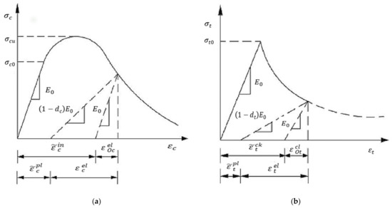 where and are the tensile stress and the compressive stress, respectively; and are the tensile and compressive strains, respectively; is the initial elastic modulus; and are plastic tensile strain and plastic compressive strain, respectively; and and are the tensile and compressive damage factors, respectively (0 means no damage, 1 means complete damage).