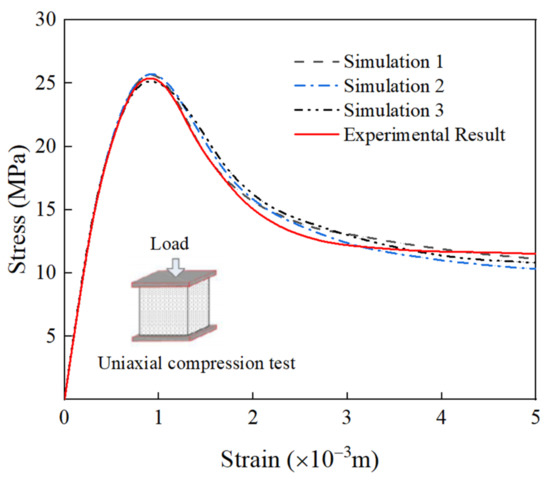 The results show that the tensile strength of the mortar matrix is generally 1/10 of the compressive strength [33,36,58,59]. Generally, ITZ is regarded as porous and weakened mortar matrix. In particular, the mechanical parameters of ITZ (elastic modulus, compressive strength, and tensile strength) are reduced to different degrees as mechanical parameters of mortar matrix, and numerical simulation is carried out many times until they are in good agreement with the test results.