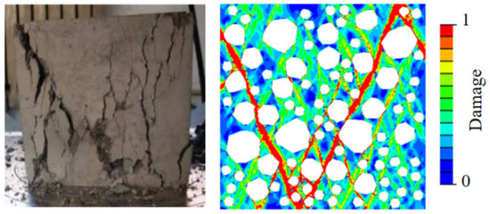 Three groups of RAC meso-models with a size of 150 × 150 mm are established, in which the content of coarse aggregate is 45% and the replacement rate is 100%. The simulated stress–strain curves and failure patterns are compared with the field test data, as shown in Figure 6. The results show that the stress–strain curves obtained by numerical simulation are in good agreement with those obtained by the test. The ascending part of the curves is approximately the same, while the descending part is slightly different. The errors of peak stress and peak strain are within 5%. Figure 7 shows the final failure result of the model. It can be seen that the final failure state of the model presents a cone-angle failure mode with multiple inclined cracks penetrating through the specimen, and the final cracking path is similar to the failure mode obtained in the test. In conclusion, the applicability of the meso-mechanical method to RAC and the rationality of material parameter selection are verified. When meso-numerical simulation is carried out by ABAQUS, the damage factor corresponding to the color bar can reflect the damage degree of the simulated sample. When the damage factor is 0, there is no crack in RAC, and the loading does not begin, indicating that the sample is not damaged. With an increase in the displacement load, the damage factor changes from 0 to 1. At first, the specimen forms a micro-crack from the ITZ, propagates along the edge of the aggregate, and spread to the mortar. Then, the damage spreads all over the stress area of the sample, and finally forms the macroscopic crack. At this time, the sample is damaged. When the damage parameter is greater than 0.9, it is considered that the cracks occur in concrete macro-scopically. When the damage factor reaches 1, the displacement load reaches the maximum value, and the sample is completely damaged. Yu et al. [67], Chen et al. [68], Benkemoun et al. [69], Li et al. [70], and Jin et al. [71,72] adopted similar expressions for color bars in previous meso-numerical simulations of concrete.