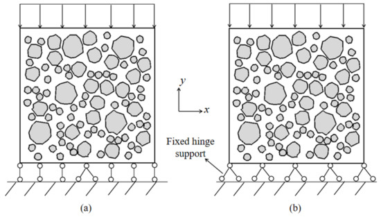 The results of several studies show that when uniaxial compression numerical simulation is carried out, failure modes with an “X” shape [68,73] and a “V” shape [74,75] as the main failure modes will be formed when different constraints are applied to the bottom of the specimen. As shown in Figure 8a, transverse restrictions on the bottom and top of the microscopic specimen are ignored, and fixed hinges are used to support the midpoint of the bottom. As shown in Figure 8b, fixed hinges are used to support each point at the bottom of the specimen. Under the two kinds of constraint conditions, the failure mode of the samples of RAC occurs under high friction and low friction, respectively. As shown in Figure 9, inclined cracks appear in RAC under high friction constraints, and the failure shape is similar to “V”, while the two-way failure mode appears when low friction constraints are involved, and the failure shape is similar to “X”. It can be seen from Figure 6 that the compression test block in the field test is mainly V-shaped failure, so the boundary condition 1 is selected for meso-numerical simulation under various working conditions.