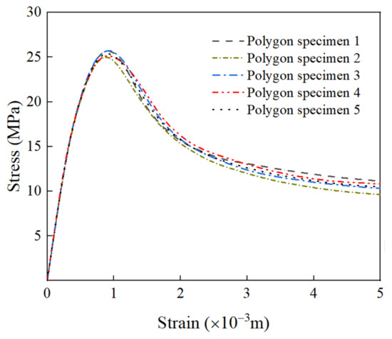 In the actual construction process, RCA is randomly distributed in concrete due to vibration and mixing, which affects the overall performance of RAC. Therefore, the study of random distribution of RCA is of great significance to the mechanical behavior of uniaxial compression. In this section, five groups of RAC numerical models with different random distribution states are established to study the influence of random distribution of RCA on the overall macroscopic mechanical properties. Figure 10 shows the stress–strain curve of RCA randomly distributed under uniaxial compression. The results show that the stress–strain curves are almost the same before the peak stress, but the softening part of the curves is slightly different. This is mainly because the number of cracks increases and develops further after the peak stress, and the different distribution of RCA will change the path of crack propagation, thus affecting the descending section of the stress–strain curve.