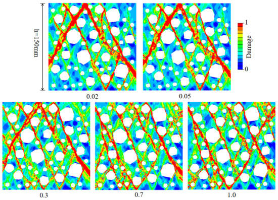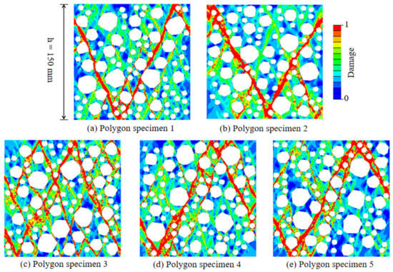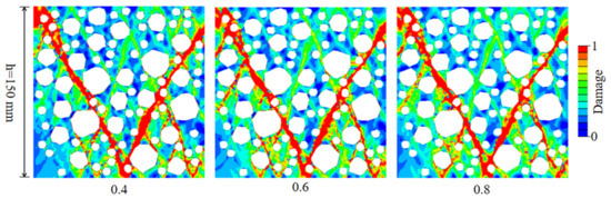 Figure 11 shows the failure patterns of RAC under a different random distribution of RCA, and the damage distribution is a typical V-shaped failure mode. The micro-crack at the interface further develops and evolves under the external load, from the interface layer to the mortar unit, causing damage to the mortar unit, and finally forming through cracks along the direction of the maximum shear stress.