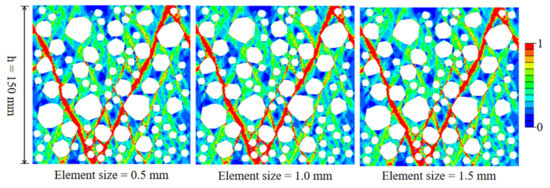 Figure 12 shows the stress–strain curves of RAC under different sizes of mesh. Although the results are slightly different, the ascending section, peak stress, and softening section are very close, indicating that the stress–strain behavior of RAC is mesh-insensitive. The failure modes of RAC of the three sizes of mesh are shown in Figure 13. It can be seen that the size of mesh has no significant effect on the general uniaxial compression damage path, and the smaller size of mesh shows a finer expansion path for local damage.