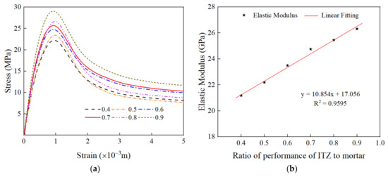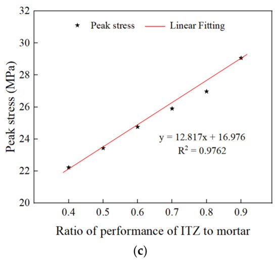 The effect of the strength of ITZ on the stress–strain curve of RAC under uniaxial compression. (a) Stress–strain curve; (b) linear fitting of elastic modulus; (c) linear fitting of peak compressive strength.