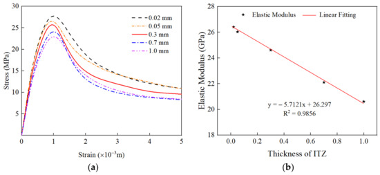 The effect of the thickness of ITZ on the stress–strain curve of RAC under uniaxial compression. (a) Stress–strain curve; (b) linear fitting of the elastic modulus; (c) linear fitting of the peak compressive strength.
