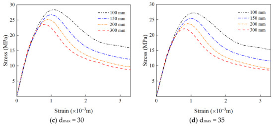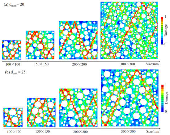 Based on the mesoscopic numerical model established above, the compressive properties of RAC with different sizes and different maximum aggregate sizes are studied to reveal the influence of the maximum aggregate size on the size effect of RAC.