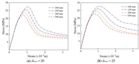 At present, concrete materials are widely used in super high-rise buildings, long-span bridges, and other large-size structures. However, with an increase in the structure size, the mechanical property index represented by the compressive strength of concrete is no longer a fixed value, but changes with the change in the geometric size of the material; thus, there is a size effect [44,45]. Currently, there are different research theories on the phenomenon of the size effect. Bažant et al. [46], Weibull et al. [47], and Carpinteri et al. [48] have proposed a variety of size effect formulas, and the rationality of these formulas is verified by the test results in a certain range. In addition, a large number of field tests and numerical simulation studies show that the size effect of concrete is mainly affected by the aggregate size, aggregate distribution, aggregate shape, initial defects, and other factors [49,50]. Among them, aggregate size is considered to be one of the most important factors affecting the mechanical properties and failure mechanism of concrete, and has an important influence on the mechanical behavior and size effect of concrete. Jin et al. [51] studied the effect of aggregate size (24–42 mm) on the cracks of internal components of concrete with different sizes (100–450 mm) during compressive failure. It is concluded that an increase in aggregate size can improve the sensitivity of strength to structural size. On the contrary, Jin et al. [52] found that an increase in aggregate size could reduce the sensitivity of the size effect when studying the size effect of different aggregate sizes on the splitting tensile strength of concrete. Compared with NAC, the field test shows that the size effect of mechanical properties of RAC is more significant. However, at the meso-scale, there are few studies on the size effect of RAC, and even fewer studies on the effect of different aggregate sizes on the compressive size effect of RAC. In addition, Bažant’s size effect law has rarely been used to verify the size effect of RAC. Therefore, it is of great research value to conduct a numerical simulation of RAC specimens with different particle sizes and structural sizes and to study the size effect of RAC compressive strength.