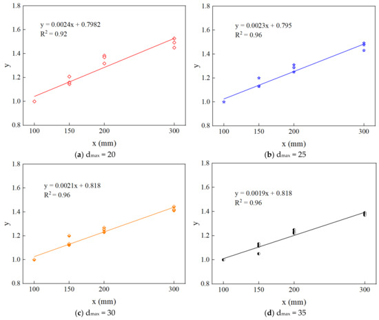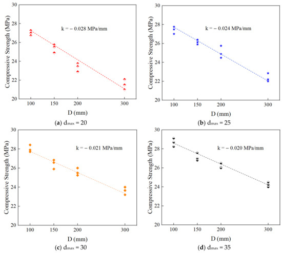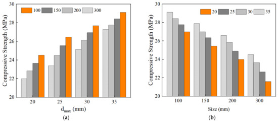 - Increasing the maximum aggregate size (within the range of this study) can reduce the sensitivity of the compressive strength of RAC to size, thus weakening the size effect. Among them, when the maximum aggregate size reaches 30 mm, a decrease in the size effect degree tends to slow down compared with the maximum aggregate size of 20 mm.