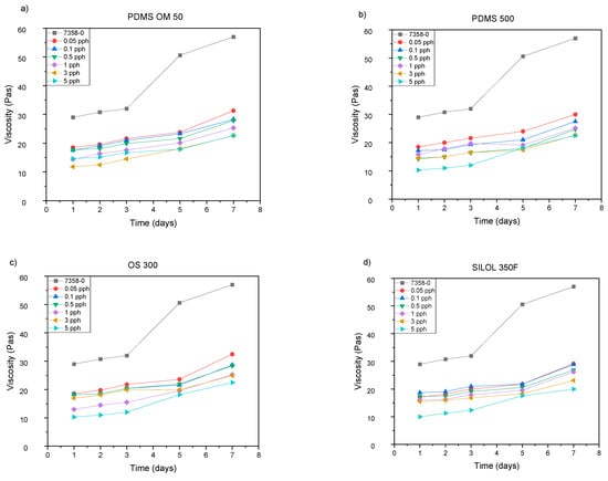 | Content of additives (pph) | 10 min | 30 min | 1 h | 3 h | 8 h | 24 h | 2 Days | 3 Days | 4 Days | 5 Days | 6 Days | 7 Days |