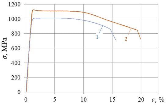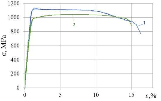 Stress–strain diagrams of the VT23 alloy after the DNP: 1—transverse direction of rolling, εimp = 1.44%; 2—longitudinal direction of rolling, εimp = 1.5% [].
