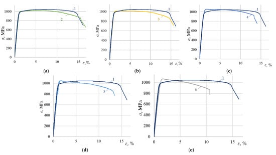 Stress–strain diagrams of the VT23 titanium alloy rolled in the transverse direction after the DNP and subsequent static tensioning, as compared to the static tensioning in the initial state (curve 1): (a) (2—εimp = 0.81%); (b) (3—εimp = 1.44%); (c) (4—εimp = 2.56%); (d) (5—εimp = 4.56%); (e) (6—εimp = 5.5%).