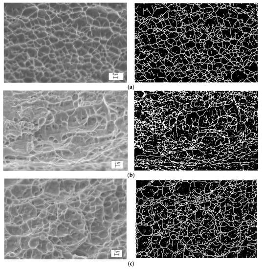Above is the qualitative analysis of the fractographic research findings. For their quantitative analysis, the authors used the designated, highly efficient computer diagnostic system for the automated processing of the images obtained [,]. Figure 6 shows the fractographic images of the fracture microrelief formed on specimen surfaces, and their binarized mappings.