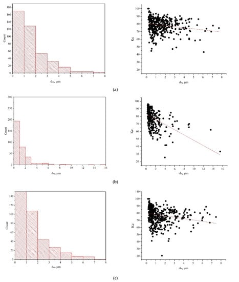 Histograms of dimple diameters and diagrams of dimple shape coefficients on fracture zones of specimens made of the VT23 alloy rolled in the transverse direction after the introduction of impulse energy due to impact-oscillatory loading followed by static tensioning: (a)—εimp = 0.81%; (b)—εimp = 2.56%; (c)—εimp = 4.56%.