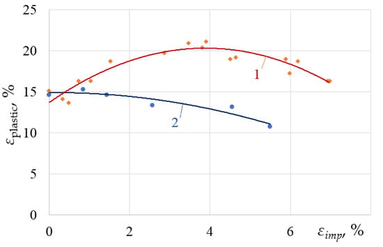 Dependence of the maximum strain of the VT23 alloy rolled in different directions on the increase in the dynamic strain increment εimp of specimens during the DNP: 1—longitudinal direction. []; 2—transverse direction.