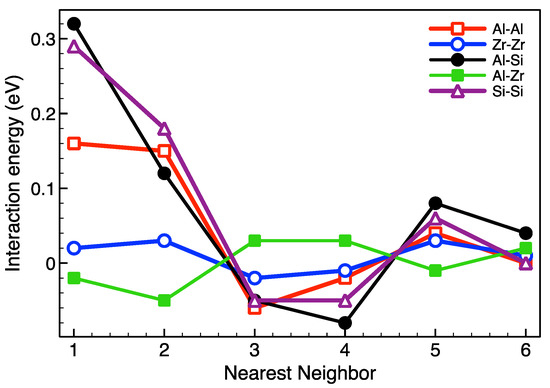As can be seen from Figure 1, the arrangement of Al atoms in the positions of third neighbors relative to each other in the hcp Ti lattice is most energetically preferable. It is the arrangement of Al atoms that determines the energy gain during the formation of the DO19 superstructure in the Ti-Al alloy (Figure 2). The interaction energy between Zr atoms also has a minimum in the position of the third neighbors, but the corresponding value is much smaller than in the case of Al; indeed, there are no ordered phases in the phase diagram of Ti-Zr. The Al-Zr interaction is characterized by the energy gain of locating Zr atoms on the 1st and 2nd coordination sphere relative to Al, which is consistent with the preferential filling of the Ti sublattice by Zr atoms in the Ti-Al-Zr alloy [33]. As a result, one should expect a weak effect of Zr addition on Al ordering and the formation of Ti3Al precipitates in the Ti-Al-Zr alloy. In contrast with Zr, Si-Si and Al-Si interactions (Figure 1) were found to be quite similar to the Al-Al interactions. This is consistent with the broad field of coexistence of the Ti3Al and Ti3Si in the ternary phase diagram.