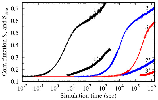 Ordering kinetics of the Ti-14%Al alloy obtained by Monte Carlo simulation at temperatures of 1000 K (curves 1, 1’), 850 K (curves 2, 2’) and 800 K (curves 3, 3’). Curves 1, 2, and 3 show the change in the correlation function S3 over time, and curves 1’–3’ show the change in the parameter Sdec.