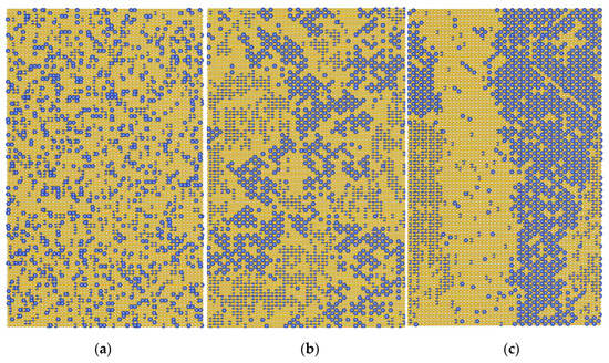 Distribution of Al atoms (blue circles) in the central section of the crystallite at different times in the Ti-14%Al alloy at temperature 850 K. (a) t = 0, (b) t = 7 × 104 s, (c) t = 2.5 × 106 s. Four (0110) layers are shown. Statistically uniform ordering (b) for the selected time is seen as alternating small antiphase domains.