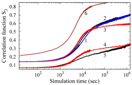 Ordering kinetics shown as the change in the correlation function S3 over time for alloys Ti-14%Al (curve (1)), Ti-14%Al-7%Zr (2), Ti-14%Al-7%Si (3) and alloys Ti-7%Al-7%Si (4), Ti-7%Al-7%Zr (5) at 850 K. Curve (6) describes the variation mS3 defined as the probability to find either the Al atom or the Si atom in the position of the third neighbor with respect to the chosen atom of Al.