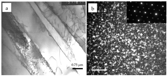 Microstructures of alloys after aging at (a) 500 °C (TEM bright-field image) and after aging at (b) 700 °C (dark-field image) [19].