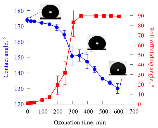 As a result, the surface of the sample becomes inhomogeneous, since small patches with hydrophilic properties appear on the superhydrophobic surface. The images presented in Figure 4b clearly show that the linear size of such patches can reach tens of micrometers. The hydrophilic region serves as an effective center for water droplets pinning, which also contributes to an increase in the roll-off/sliding angle for the samples ozonated during the prolonged time and transition from “lotus effect” to the “rose petal effect”.
