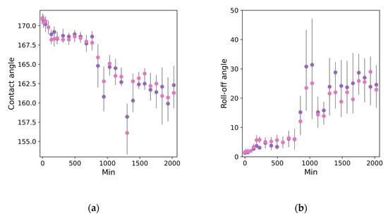 The impact of ozonation time on the values of contact (a) and roll-off angles (b) of tested samples. Different colors correspond to two different samples tested simultaneously.