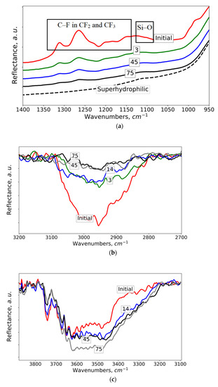 Spectroscopic data presented in Figure 3a,b indicate the decrease in the quantity of the methoxy-{3-[(2,2,3,3,4,4,5,5,6,6,7,7,8,8,8-pentadecafluorooctyl)-oxy]-propyl}-silane on top of textured elements and inside the nanopores. Note, that as it was detected in [2,17], in the course of the superhydrophobic samples preparation, the fluorooxysilane chemisorbed onto the surface of texture elements from the vapors and condensed with further encapsulation into nanopores. The interaction of the fluorooxysilane with ozone leads to the partial breaking of O-Si bonds linking the hydrophobic molecules to the surface and the desorption of these molecules from the surface. The conclusion that the break of the chemical bond occurs precisely along the O-Si bond is based on the fact that we observed a gradual decrease in the heights of all bands associated with oscillations in the hydrophobic tail of the fluorooxysilane molecules. To demonstrate this process, in Figure 3a the evolution of the vibration bands intensity with the increase in the time of ozonation is shown for C-F, Si-C and Si-O vibrations in CF2, CF3, Si-CH2, and Si-O-Si groups [24,25]. For the comparison, the spectrum of hydrophilic sample (before deposition of the hydrophobic agent) is shown in Figure 3a by a dashed line. In Figure 3b the range of C-H stretching vibrations in CH2 groups is presented. The numbers on the spectra indicate the total time of ozonation before the spectra measurement. At the same time, the fact that the coatings preserve high contact angle (>160°) unambiguously indicates that even after 75 h of exposure to ozone, the hydrophobic molecules are present on the surface in a sufficient amount. The analysis of the range of spectra related to O-H stretching vibrations (Figure 3c) reveals some minor increase in the intensity of bands associated with IR activity of monomer and dimer adsorbed water molecules, indicating the adsorption of individual water molecules onto the superhydrophobic surface in contact with the ozone-enriched atmosphere for a long time.