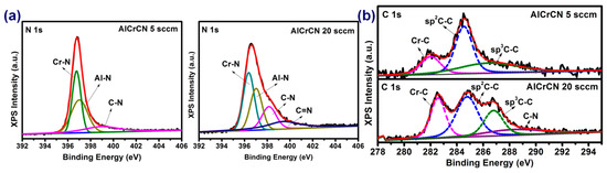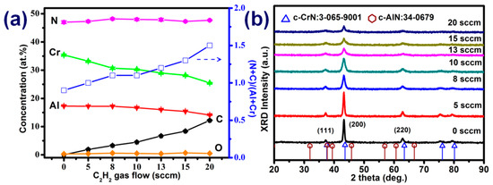 | C2H2 Flow | Cr-N (%) | Al-N (%) | C-N (%) | C=N (%) | Cr-C (%) | sp2 (%) | sp3 (%) | N-C (%) | sp3/sp2 |