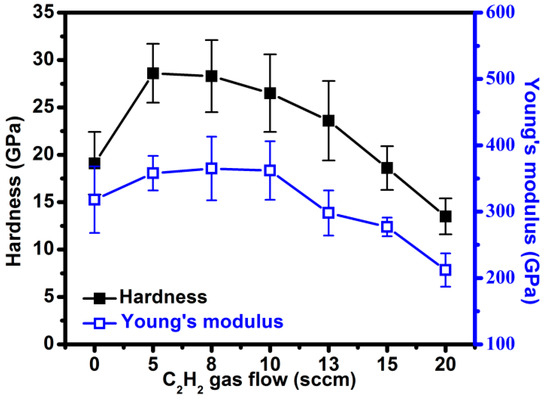 - Yate, L.; Caicedo, J.; Macias, A.H.; Espinoza-Beltrán, F.; Zambrano, G.; Muñoz-Saldaña, J.; Prieto, P. Composition and mechanical properties of AlC, AlN and AlCN thin films obtained by rf magnetron sputtering. Surf. Coat. Technol. 2009, 203, 1904–1907. [Google Scholar] [CrossRef]