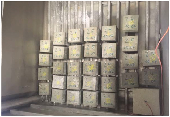 The next study aimed at determining the parameters of the designed cement concretes was the study of the frost resistance of concrete. This test was carried out by the usual method in order to verify the degree of frost resistance F assumed at the design stage of the mixture. However, this degree in the assumptions corresponds to the N index, which is equal to the number of expected years of use of the structure. The usual method makes it possible to take into account the degree of internal destruction of concrete, characterized by the decreased strength of the sample, as well as the external destruction, determined by the loss of mass of the sample. The frost resistance test was carried out in accordance with PN-88/B-06250:1988 Ordinary concrete [33]. The test was carried out with the use of the TOROPOL K-15 testing machine. Samples prepared for frost resistance testing in this device are shown in Figure 4.