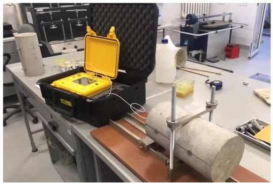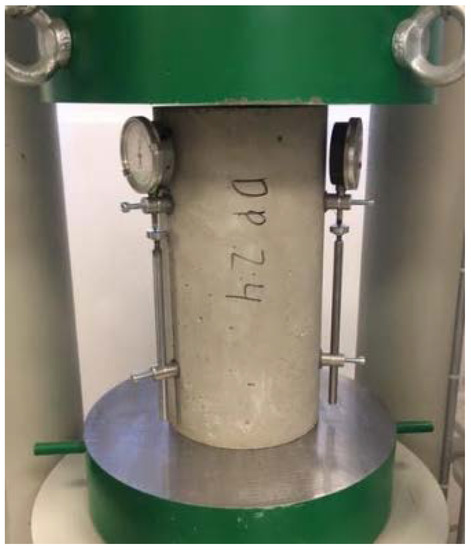 In order to determine the physical parameters of the designed cement concretes, a study of the elastic modulus was carried out. Cylindrical samples with a diameter of 150 mm and a height of 300 mm were prepared for the study. The study of elastic modulus was carried out using two methods. The first method consisted in determining the modulus of elasticity using the resonant method. In this method, the modulus of elasticity is determined by the propagation of the waves in the sample. Vibrations are caused by hitting a ball of a properly selected diameter on the base of the cylinder. Based on the measured wave, the device determines the frequency of vibrations and the modulus of elasticity of the tested material. This test is a non-destructive test of the element under study. The test was carried out with the use of the JAMES INSTRUMENT V-E-400 testing machine (Figure 5). In the second method, tests of the elastic modulus were carried out in accordance with PN-EN 12390-13:2014 Concrete tests—Part 13: Determination of the secant modulus of elasticity at compression [34]. The test was carried out with the use of the FORM TEST MEGA 6 3000-150 testing machine (Figure 6).