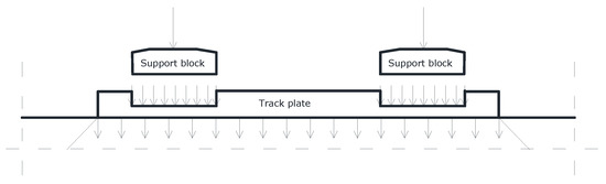 The main part of the experimental research was to determine the impact of the stiffness and strength of block supports on the strength of the entire ballastless surface, and thus on the strength of the track plate made of cement concrete. According to the adopted model, there are tensions of concrete in the track plate. At the same time, under the block supports, the forces from the wheeled vehicle cause the concrete to stretch downwards, and in the middle of the length of the slab the phenomenon of lifting the slab is triggered. The plate load model adopted for the cross-sectional test is shown in Figure 7.