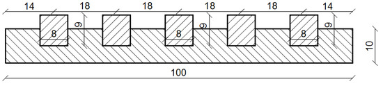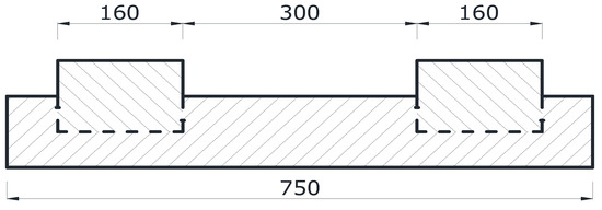 Due to the research possibilities, in order to check the tensile strength when bending the track plate with embedded block supports, a laboratory sample constituting 30% of the actual dimensions was prepared. The dimensions of the sample on which the tests were carried out were 100 mm × 150 mm × 750 mm and were adapted to the forms equipped by the laboratory. Figure 8 shows a diagram of the test samples, and Figure 9 shows the sample.