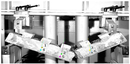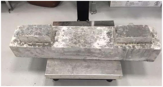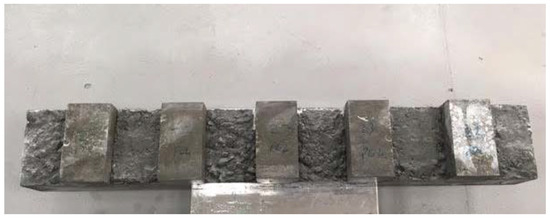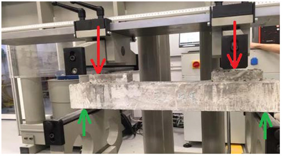The tests (Figure 10) were carried out for all cement concretes Z2–Z5 intended for use in block supports. The load was applied in the middle of the block supports so as to map the forces occurring in the structure. The support points were taken at a distance of 5 cm from the edge of the sample. The adoption of such a spacing of supports was aimed at recreating the variant of the destruction of the substructure during the operation of the railway line.