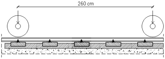 Another test aimed at determining the strength of block supports on the strength of the entire surface was to check the strength of the longitudinal section. The purpose of this test was to check the load capacity in the direction along the track, derived from the axle load of the bogie of the AEG12X locomotive, with a spacing of 2.60 m. The axle load of the locomotive is 210 kN. The plate load model adopted for longitudinal section testing is shown in Figure 11.