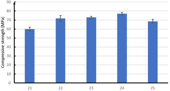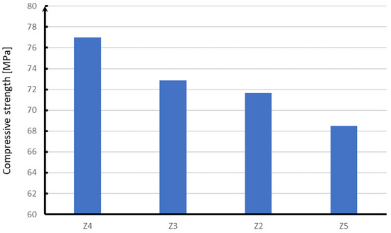 In the case of compression (Figure 16), the next in terms of strength are samples with the addition of polypropylene fibers, which in relation to glass fibers are characterized by a strength lower by about 4 MPa. On the other hand, steel fibers have a strength lower by about 5 MPa than glass fibers. The lowest compressive strength of about 68 MPa is characterized by concrete without reinforcing fibers.