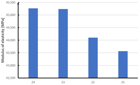 Analyzing the modulus of elasticity of concrete samples (Figure 18), it can be concluded that, as in the case of compressive strength, the highest module is characterized by samples with the addition of glass and polypropylene fibers. The difference between the obtained results for both fibers is within the limit of statistical error. Steel fibers are characterized by a modulus of elasticity lower by about 1000 MPa, while samples without the addition of fibers are characterized by a module lower by about 2000 MPa.