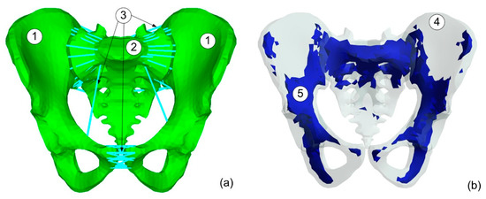 Model of pelvic ring with ligaments. (a) Pelvis model: 1—Pelvic bones, 2—Sacrum, 3—Ligaments, (b) Trabecular bone map: 4—cortical bone, 5—trabecular bone.